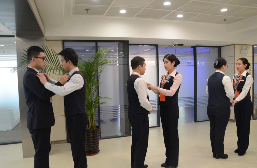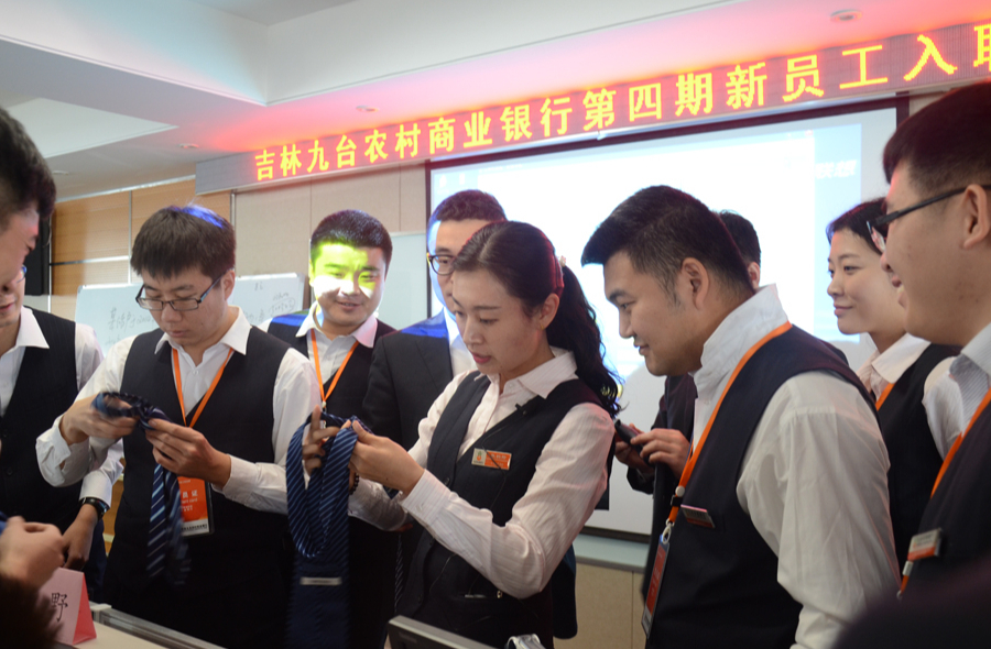 The 4th term new employee orientation training class of 2014 the teacher is instructing the trainee how to tie the necktie