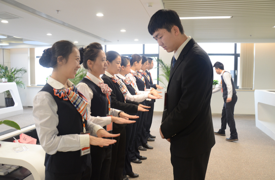 The 4th term new employee orientation training class of 2014 the mutual inspection during morning exercise